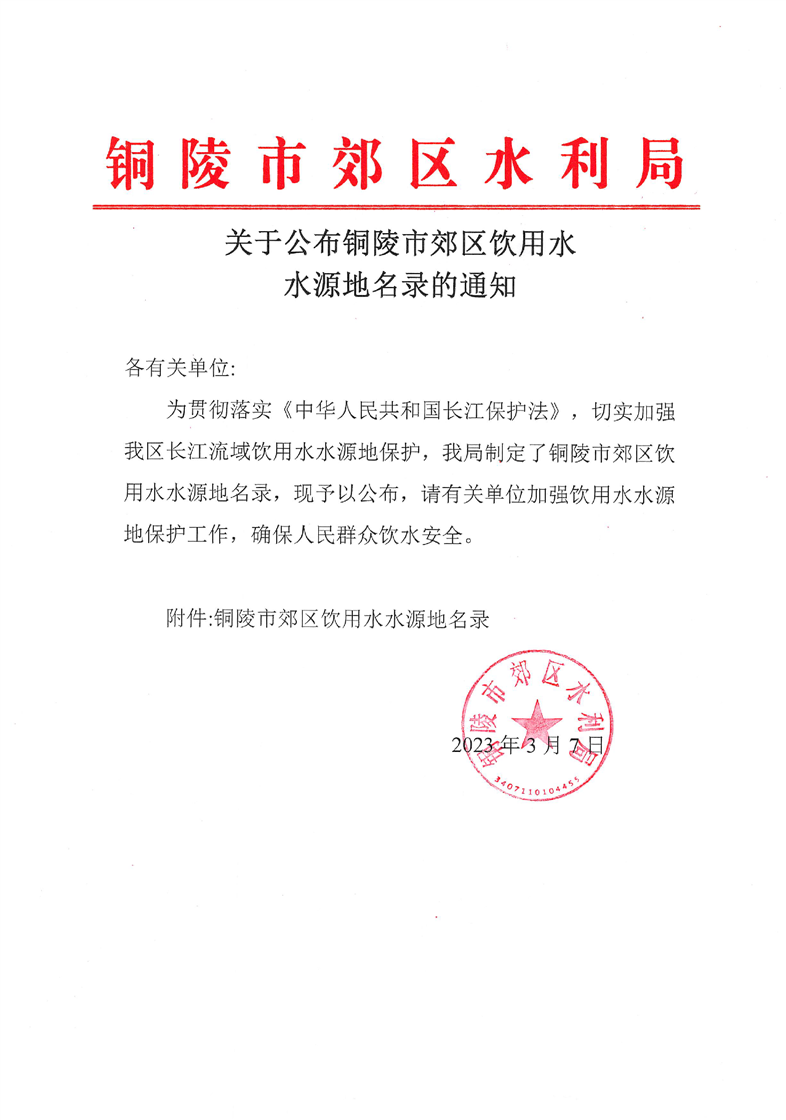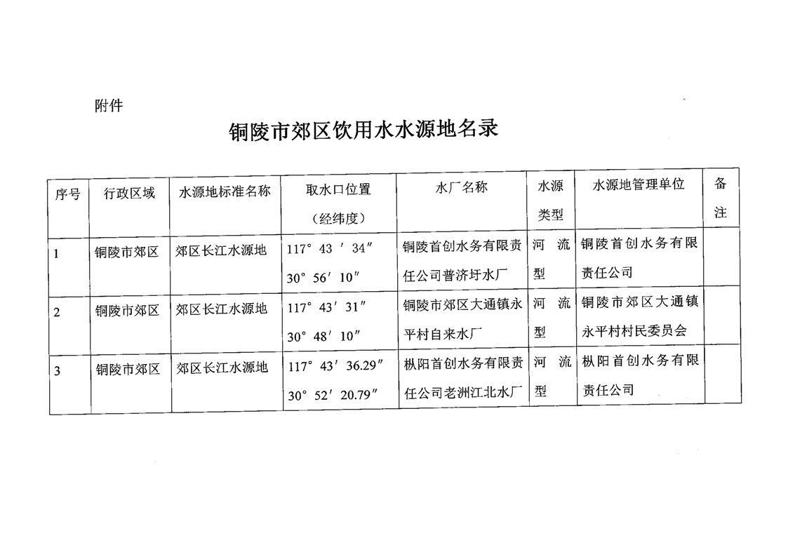 关于公布铜陵市郊区饮用水水源地名录的通知