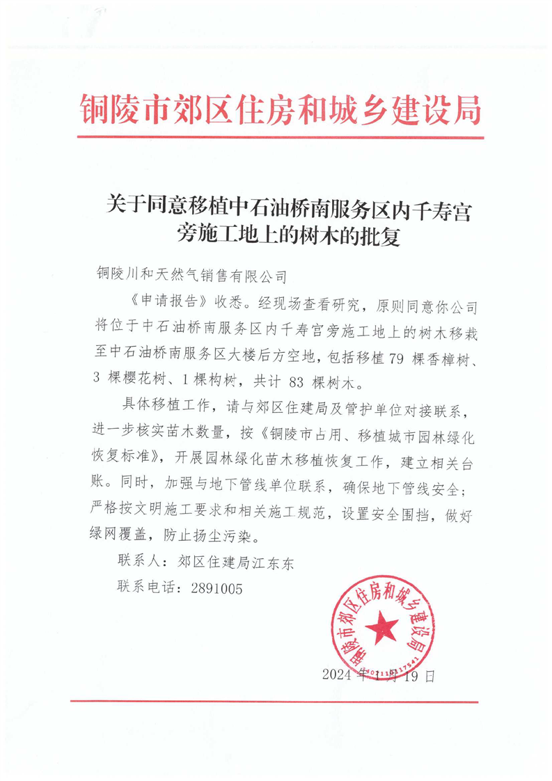 关于同意移植中石油桥南服务区内千寿宫旁施工地上的树木的批复