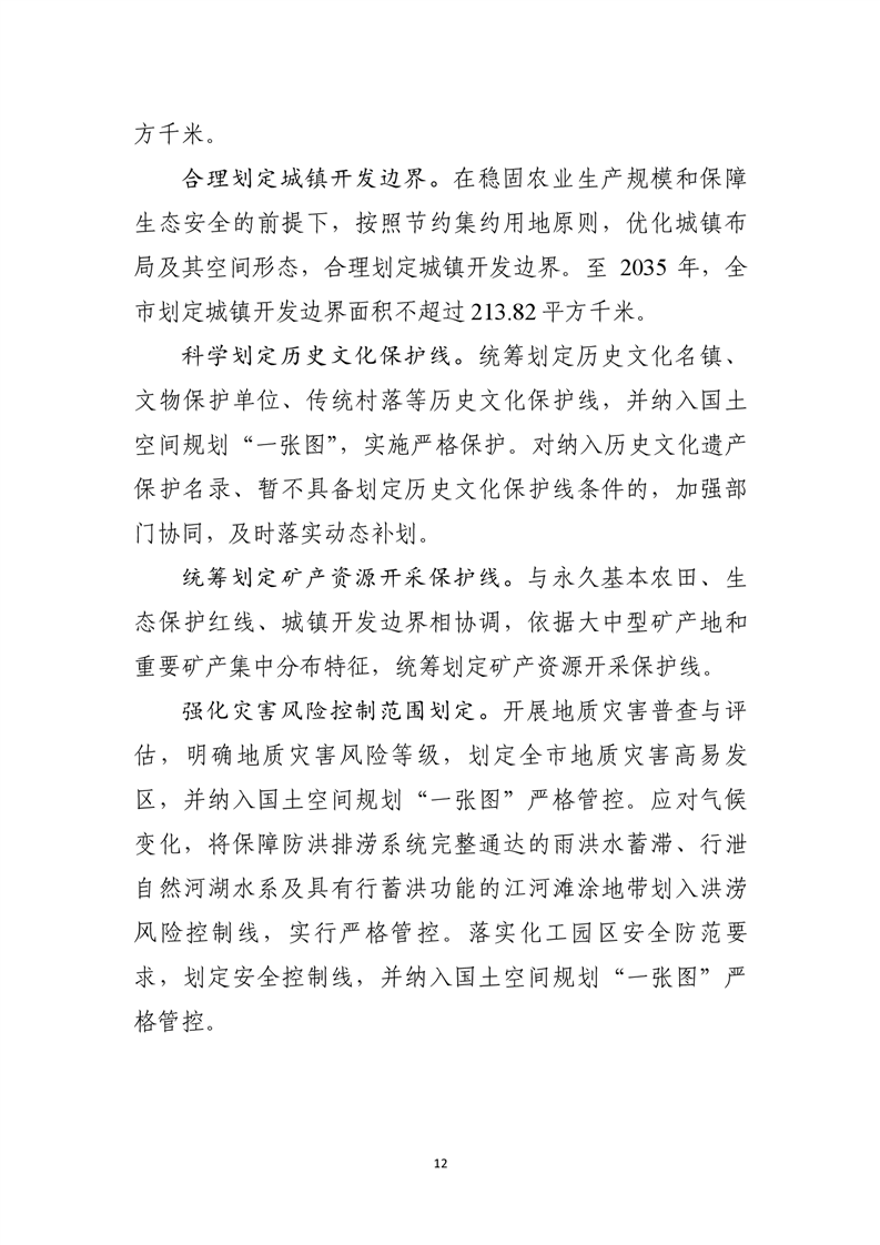 规划期内全市耕地保有量不低于136.33万亩,永久基本农田保护面积不低于117.91万亩;全市划定生态保护红线面积不低于481.08平方千米;全市划定城镇开发边界面积不高于213.82平方千米。