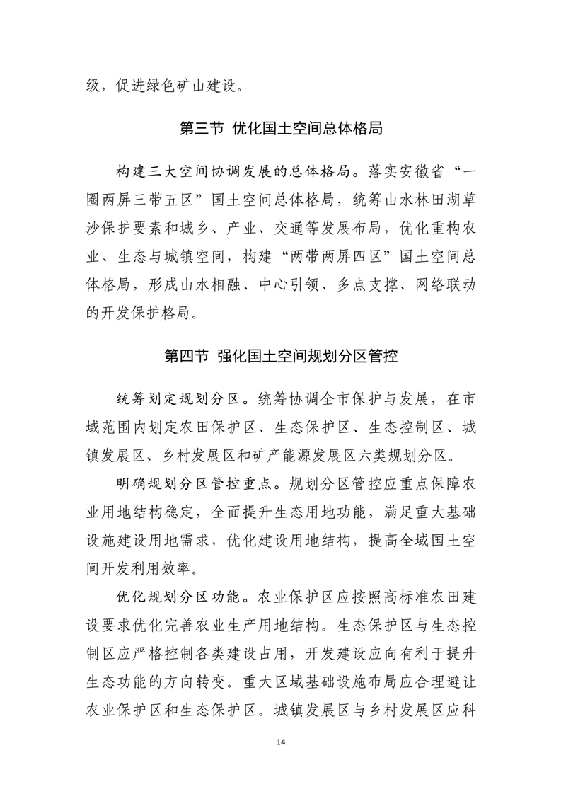 积极融入长三角一体化发展格局,协同建设安徽沿江城市带、安池铜城市组群、皖南国际文化旅游示范区,以三条控制线为基础,深化落实主体功能区战略,构建“两带两屏四区”的国土空间总体格局、“一江两岸四区多核”的农业空间格局、“两带两屏三区八核”的生态空间格局和“一带三轴一核三区”的城镇空间格局。