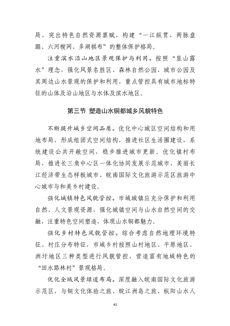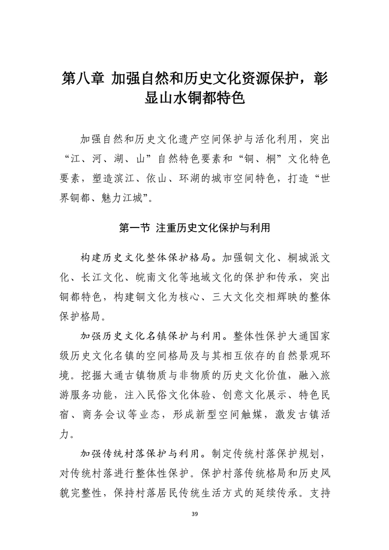 加强铜文化、桐城派文化、长江文化、皖南文化等地域文化的保护和传承,构建铜文化为核心、三大文化交相辉映的整体保护格局。保护好各级文物保护单位及其周围环境,保护和传承非物质文化遗产。强化城市设计、村庄规划,优化城乡空间形态,注重城镇空间与山水自然空间的交融,体现山水铜都魅力。