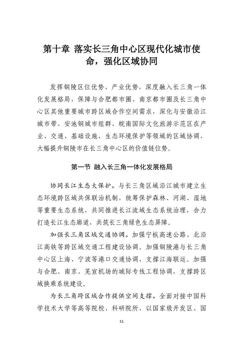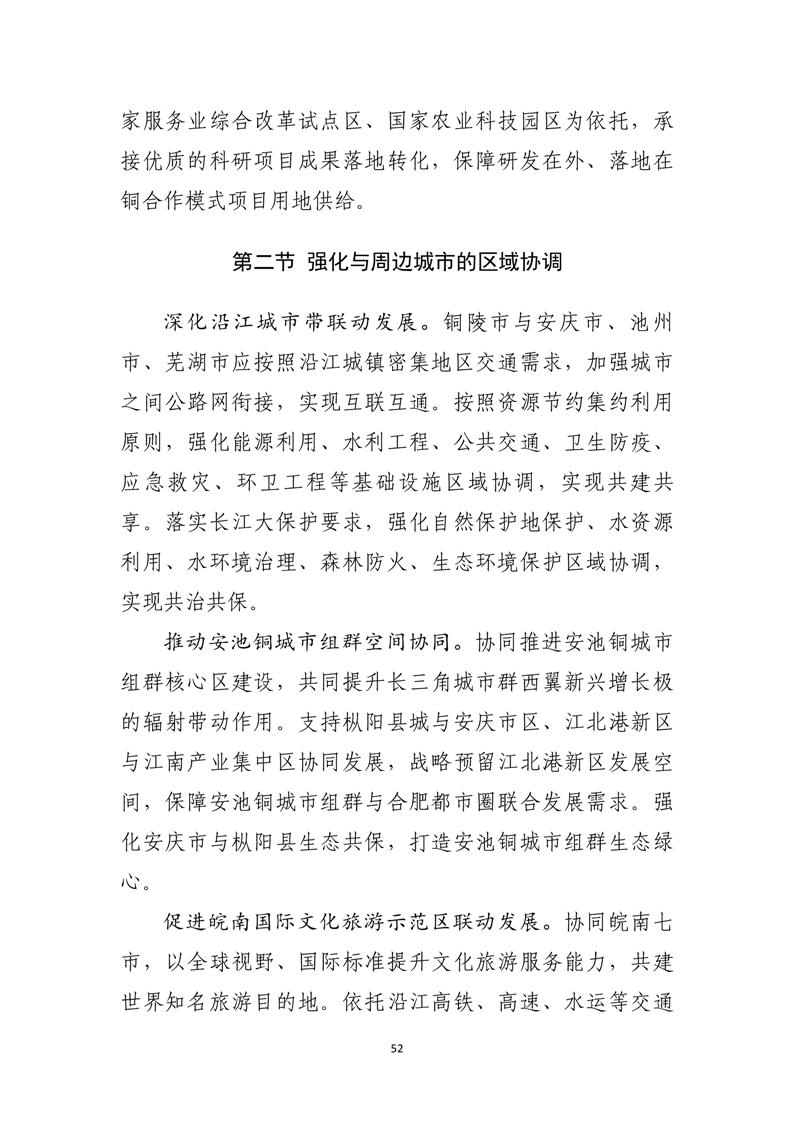 发挥铜陵区位优势、产业优势、政策优势,深度融入长三角一体化发展。深化与安徽沿江城市带、安池铜城市组群、皖南国际文化旅游示范区区域协调,大幅提升铜陵市在长三角中心区的价值链位势。