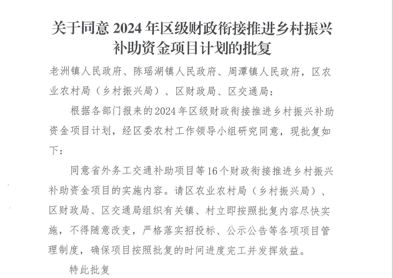 【项目计划批复】关于同意2024年区级财政衔接推进乡村振兴补助资金项目计划的批复