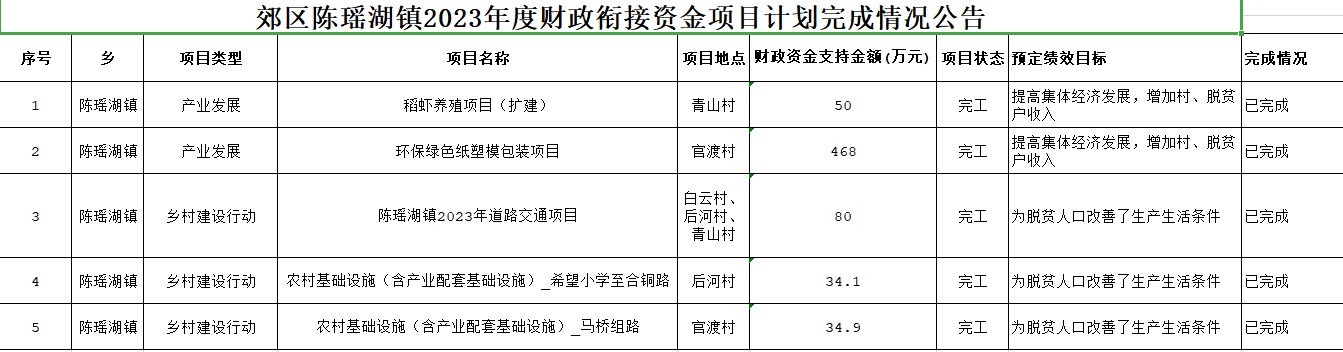 郊区陈瑶湖镇2023年度财政衔接资金项目计划完成情况公告