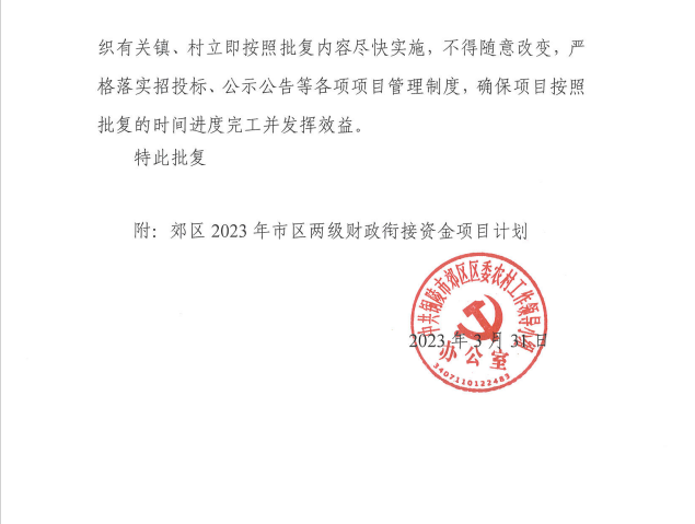 附件:郊农工办〔2023〕4号,关于同意2023年市、区财政衔接推进乡村振兴补助资金项目计划的批复.pdf【998.72 KB】