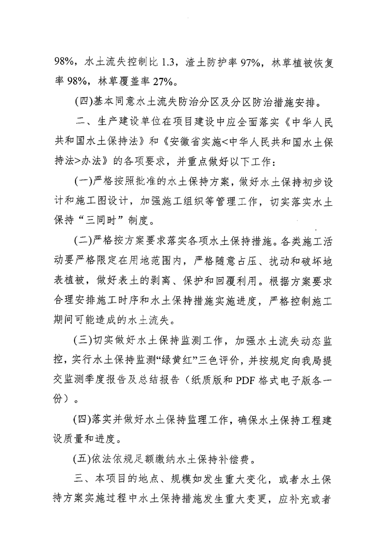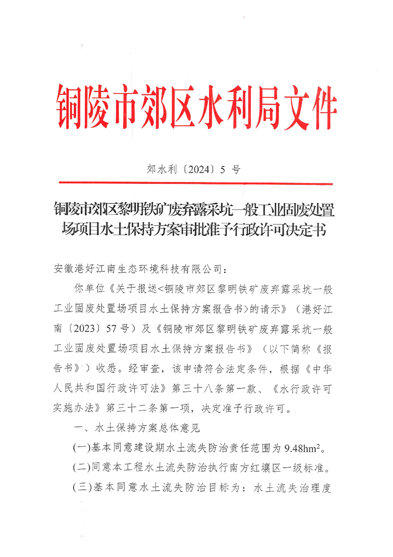 铜陵市郊区黎明铁矿废弃露采坑一般工业固废处置场项目水土保持方案审批准予行政许可决定书