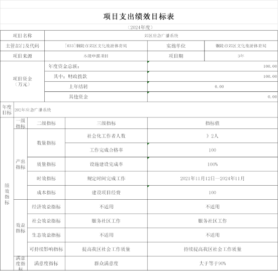 (镇、街道、景区)或村多级共用要求,按照播发计划向农村 地区传送各级广播重点节目或本地对农特定节目;当上级广 播时,下级自动被唤醒并转播上级广播;根据预先设置的优 先级别,下级可以插入本地广播,根据优先级关系,上下级 都可以分时控制终端设备;该系统可实现区、乡(镇、街道、 景区)、村三级联播可控。2、行政区划广播功能系统具备基 层组织(乡镇、村)按行政区划播出功能,可以随时按照需要 对本辖区按行政区划广播,可以设置广播音源、广播区域、 单播地址、组播地址、广播音量等。3、自动定时广播功能 系统能根据实际使用需求,可按照不同时段自动启动本地广 播,实现无人值守。根据要求可以设置自动广播播放流程,每一个自动广播播放流程可以独立选择广播音源、广播区域、 单播地址、广播音量;定时广播播放流程之间的设置互不干 扰。4、快速应急广播功能系统具备快速启动本地应急广播 功能,预先设置紧急广播音源和区域,在应急情况时,相对 应的音源及广播区域就自动唤醒,无论先前广播音量的状态 如何,紧急广播唤醒后自动切换音量状态为最大音量 5.优先 级别设置功能系统在多级同时播发时,综合考虑行政层级、 突发事件类型等级等因素。 (6)年度预算安排。100.0 万元。 (7)绩效目标。