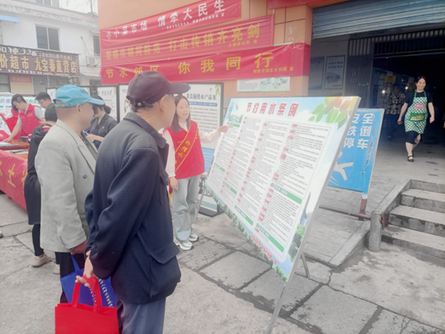 为进一步宣传贯彻国家《节约用水条例》,倡导居民养成合理用水的良好习惯,增强全社会节水意识,6月5日,铜陵市郊区水利局联合郊区河长办、区人民法院、大通镇人民政府在大通菜市场开展“节水宣传进乡村”活动。
