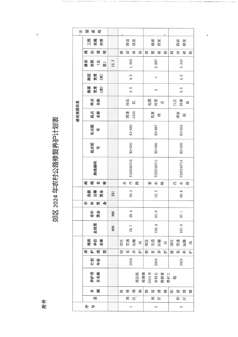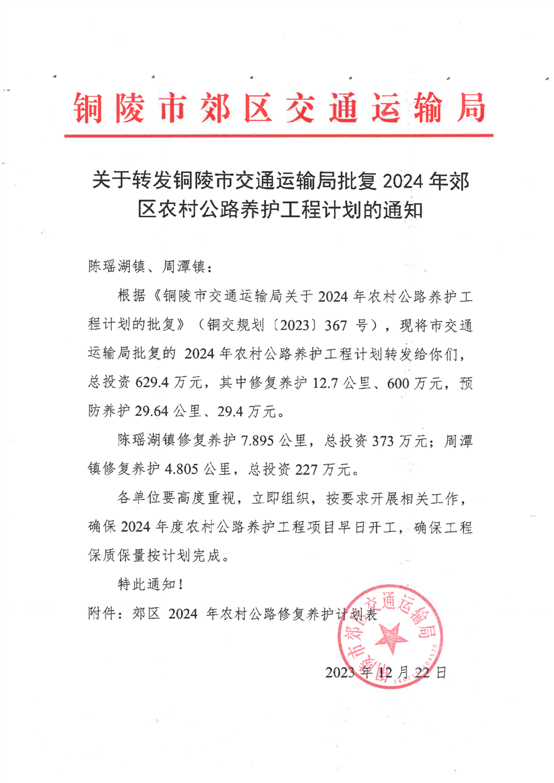关于转发铜陵市交通运输局批复2024年郊区农村公路养护工程计划的通知