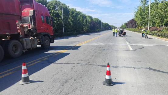 (2)对滨江大道(山水之门至横港小学段)缺失的车辆分隔线、公路边线进行补缺、补差。完成热熔标线22㎡,约220条。热熔标线1、2如下所示: