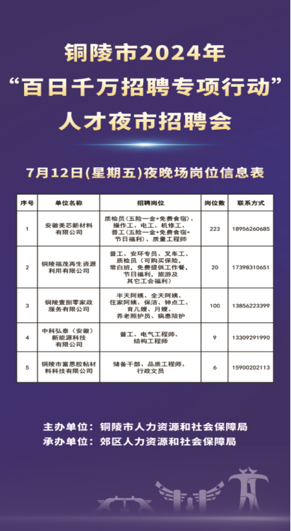 招聘会时间:下午19:00—21:00 二、招聘会地点 铜陵万达广场一楼中庭 三、活动主题 郊区2024年“百日千万招聘专项行动”人才夜市招聘会 四、举办机构