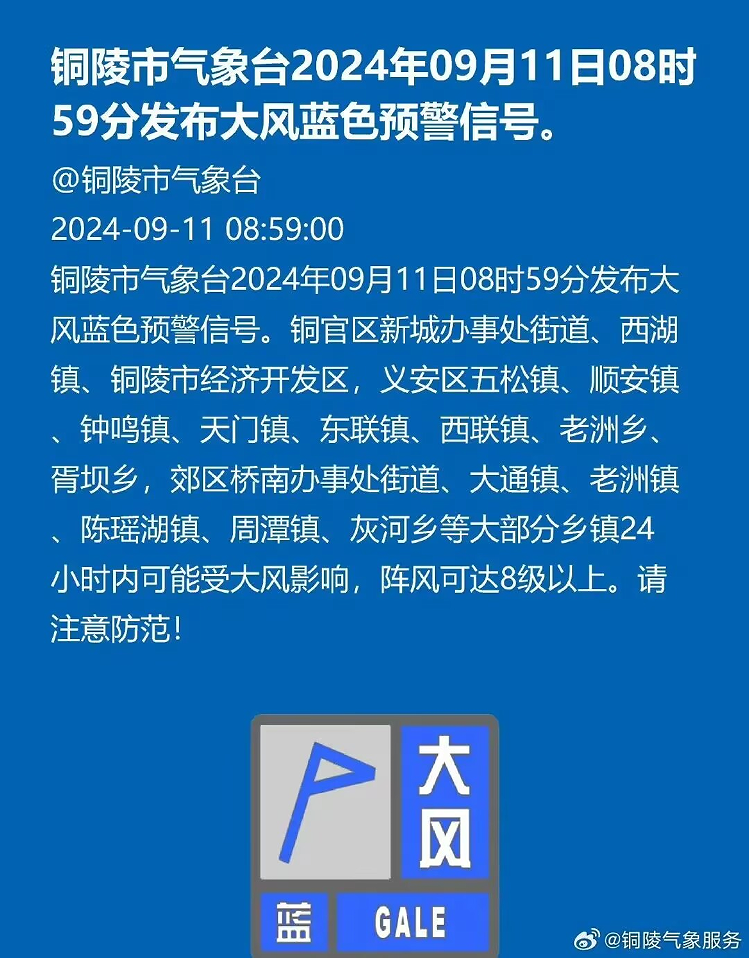 【预警发布】转发铜陵市气象台2024年09月11日08时59分发布大风蓝色预警信息