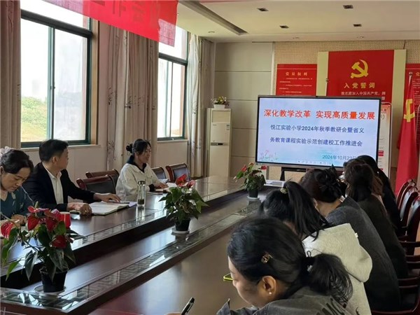 金桂飘香,硕果盈枝。为深化教学改革,实现高质量发展,悦江实验小学于10月23日召开了秋季教研会暨省义务教育课程实施示范创建校工作推进会。校领导班子成员出席会议,校委会成员、各学科教研组长、2024年市级课题立项的负责人参会。会议由教科室主持。