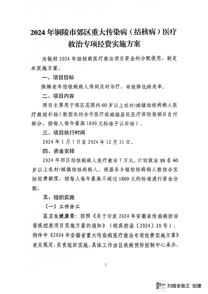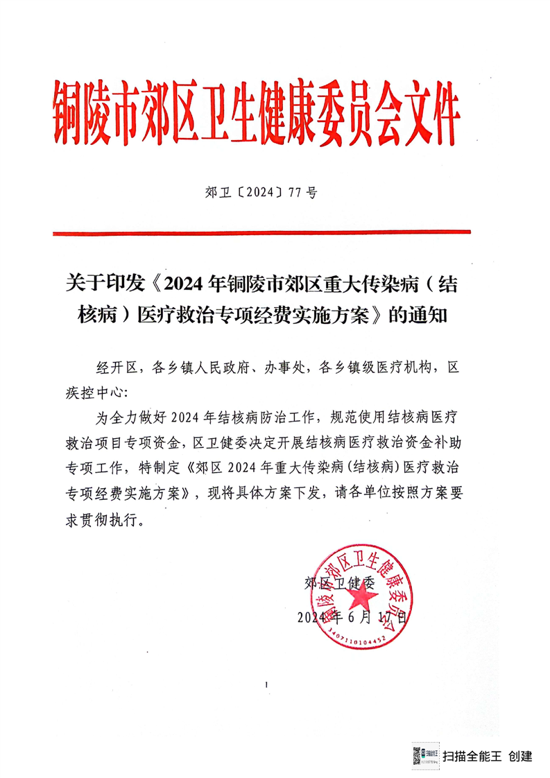 关于印发《2024年铜陵市郊区重大传染病(结核病〉医疗救治专项经费实施方案》的通知