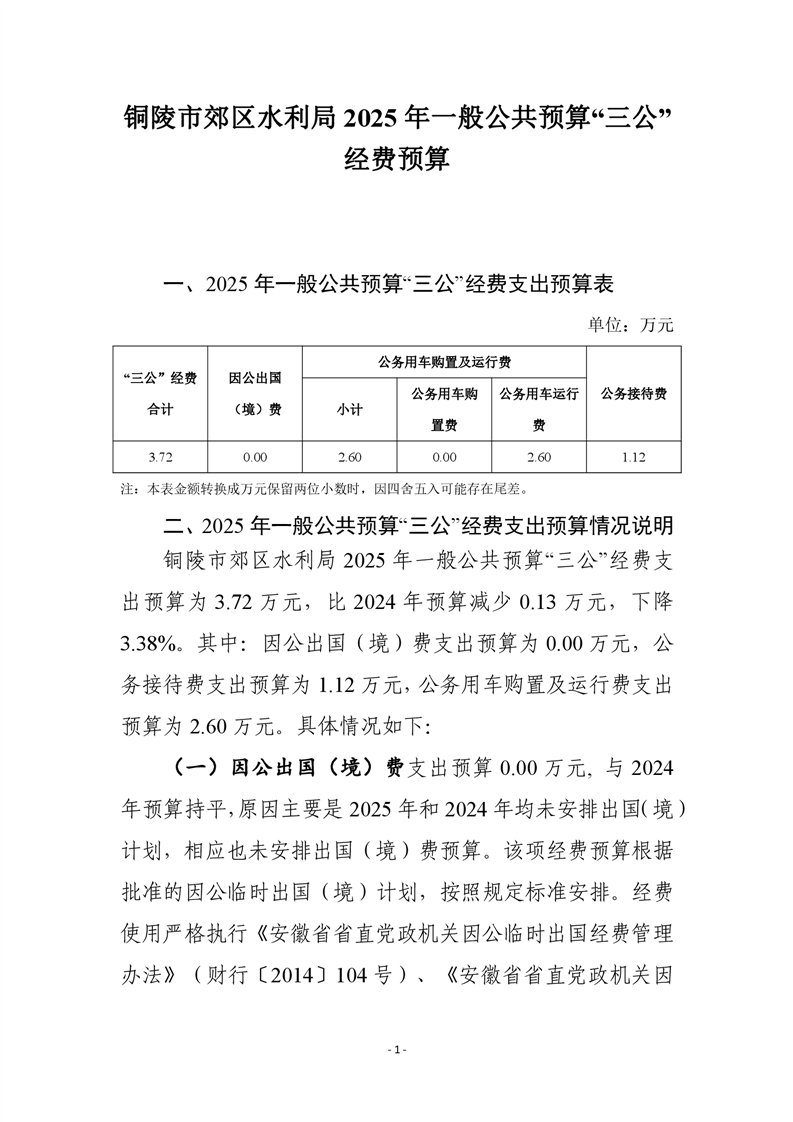 铜陵市郊区水利局2025年度三公经费预算信息公开