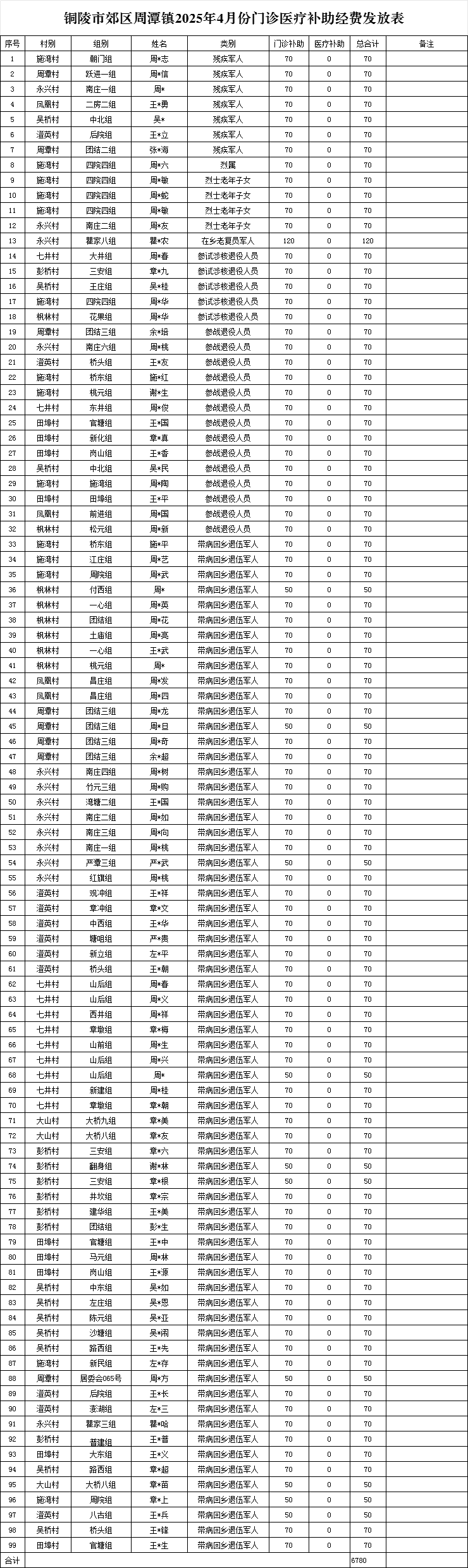 铜陵市郊区周潭镇2025年4月份门诊医疗补助经费发放表