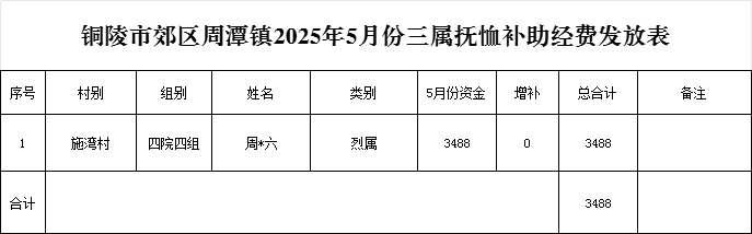 铜陵市郊区周潭镇2025年5月份三属抚恤补助经费发放表