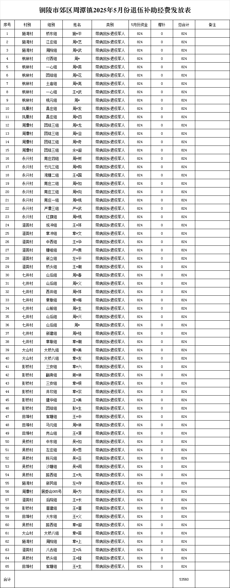 铜陵市郊区周潭镇2025年5月份退伍补助经费发放表