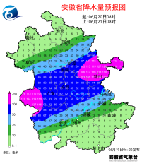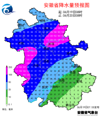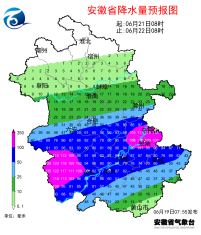 未来三天累计降水量(19日08时至22日08时):江北普遍有100~150毫米,其中六安、安庆、合肥、滁州、蚌埠、淮南、宿州、阜阳南部、芜湖、马鞍山等市 150~200毫米,其中六安、安庆等市局地可达300毫米。