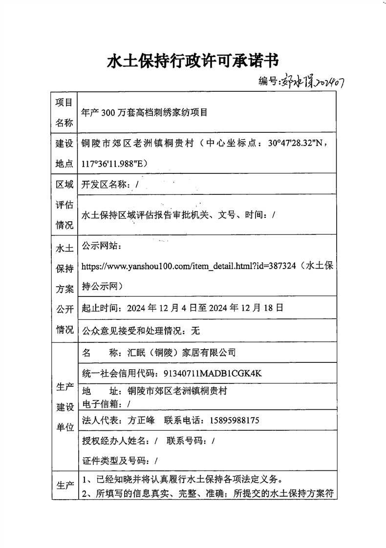 年产300万套高档刺绣家纺项目水土保持行政许可承诺书