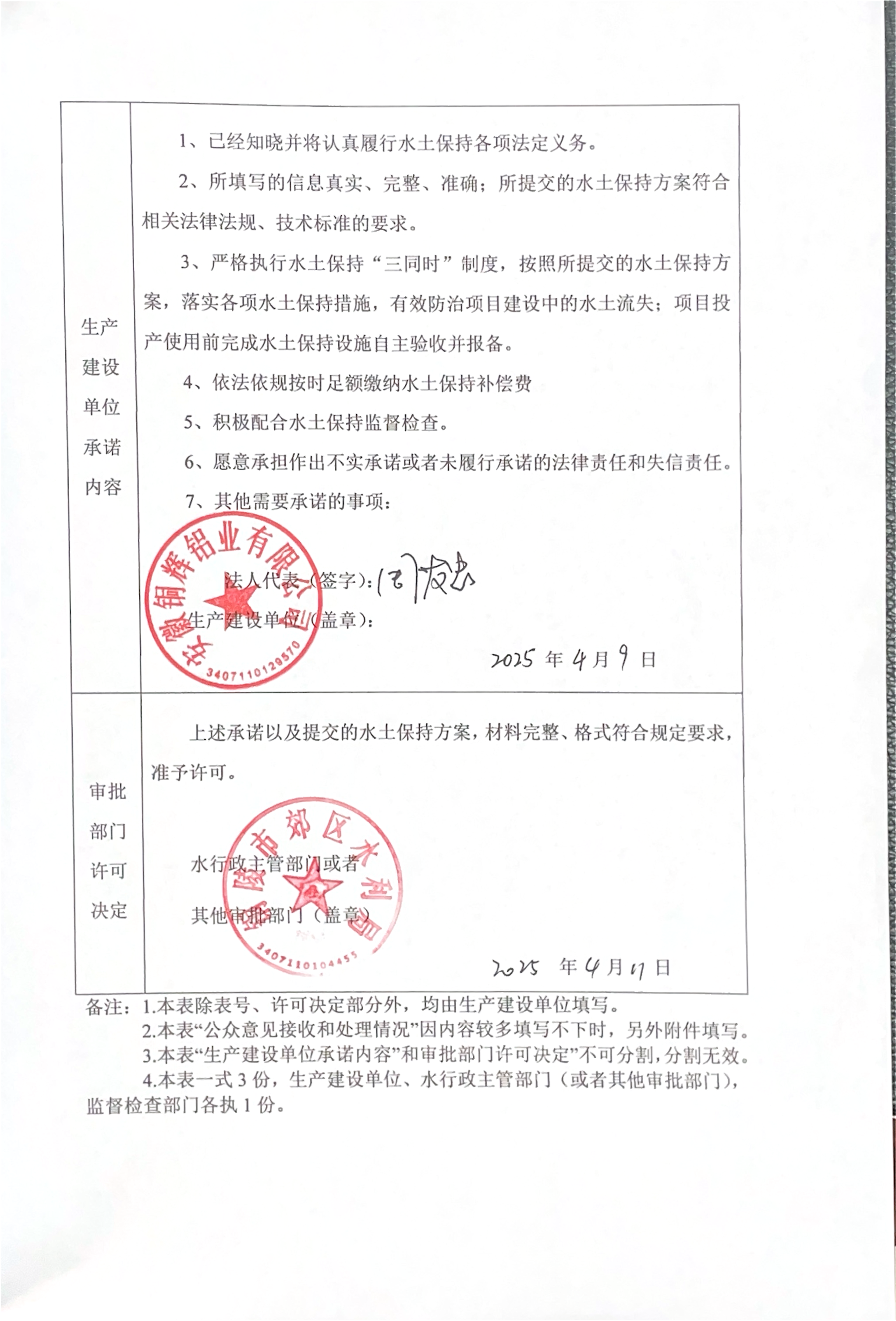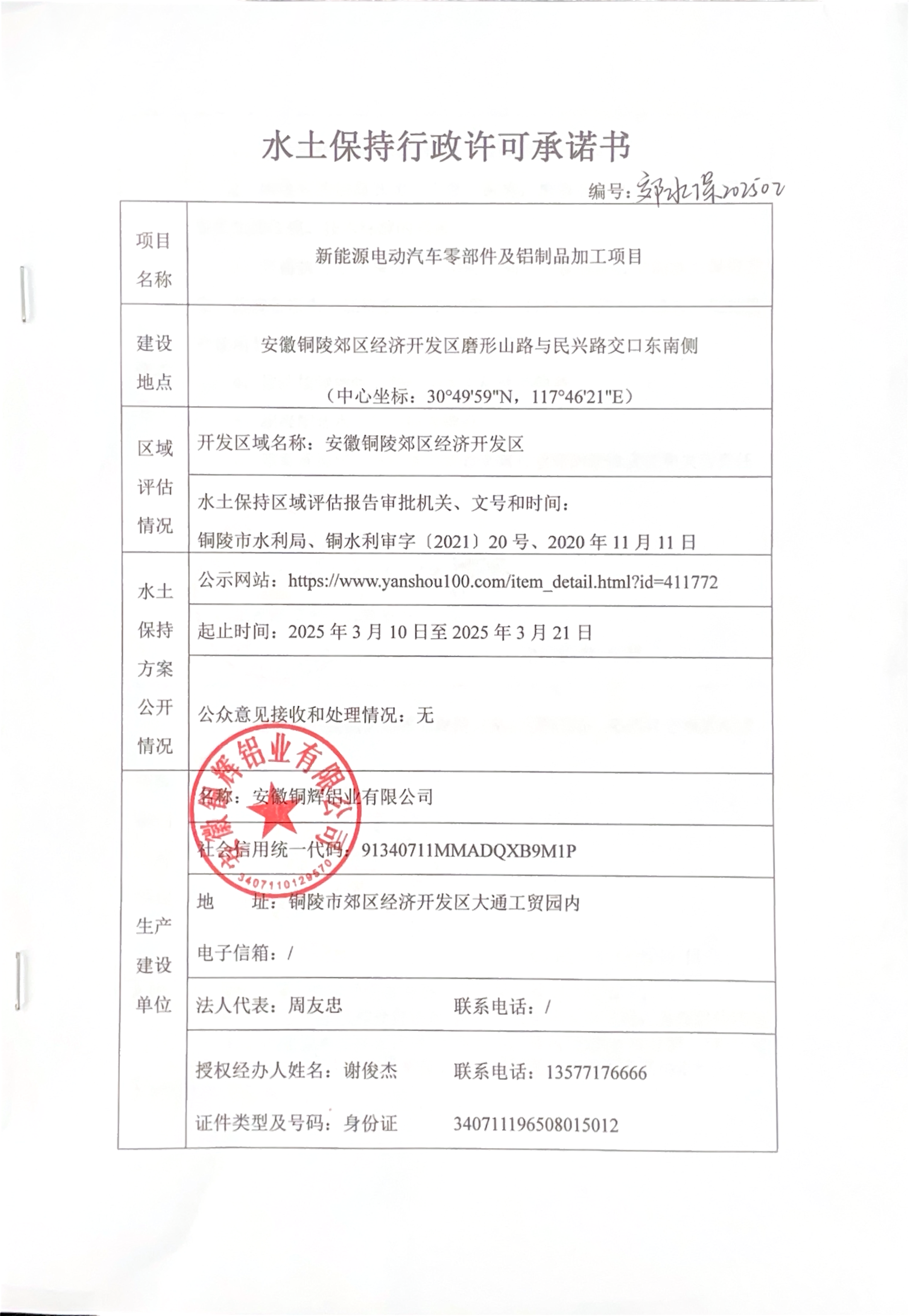 新能源电动汽车零部件及铝制品加工项目水土保持行政许可承诺书