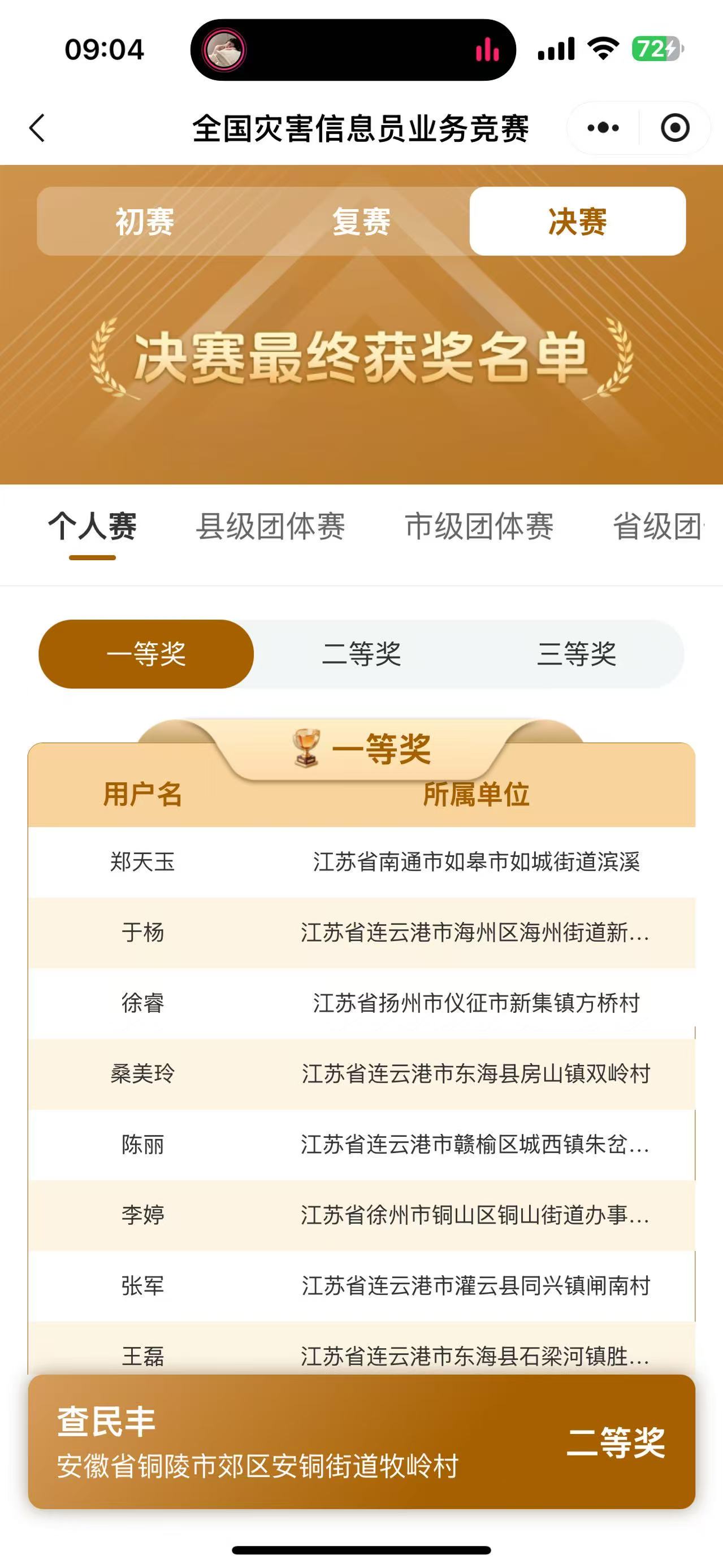 在2025年国家防灾减灾救灾委员会办公室举办的首届“全国灾害信息员业务技能大赛”中,来自铜陵市郊区安庆矿区办事处牧岭村的村级灾害信息员查民丰同志凭借扎实的业务功底和过硬的工作经验,通过初赛、复赛、决赛层层淘汰,最终从全国村级灾害信息员中脱颖而出,荣获个人二等奖,成为安徽省铜陵市郊区参赛选手中的佼佼者。这位扎根基层防灾一线的"哨兵",用脚步丈量风险,用数据守护平安,在日常工作与竞技赛场的双重考验中,诠释了新时代灾害信息员的使命担当。他用实际行动生动证明:平凡岗位上的坚守,终将成就不凡的业绩;基层一线的实践,永远是成长最坚实的土壤。在防灾减灾的道路上,正是无数像查民丰这样的"哨兵"默默守护,才筑起了保障人民群众生命财产安全的坚固防线。