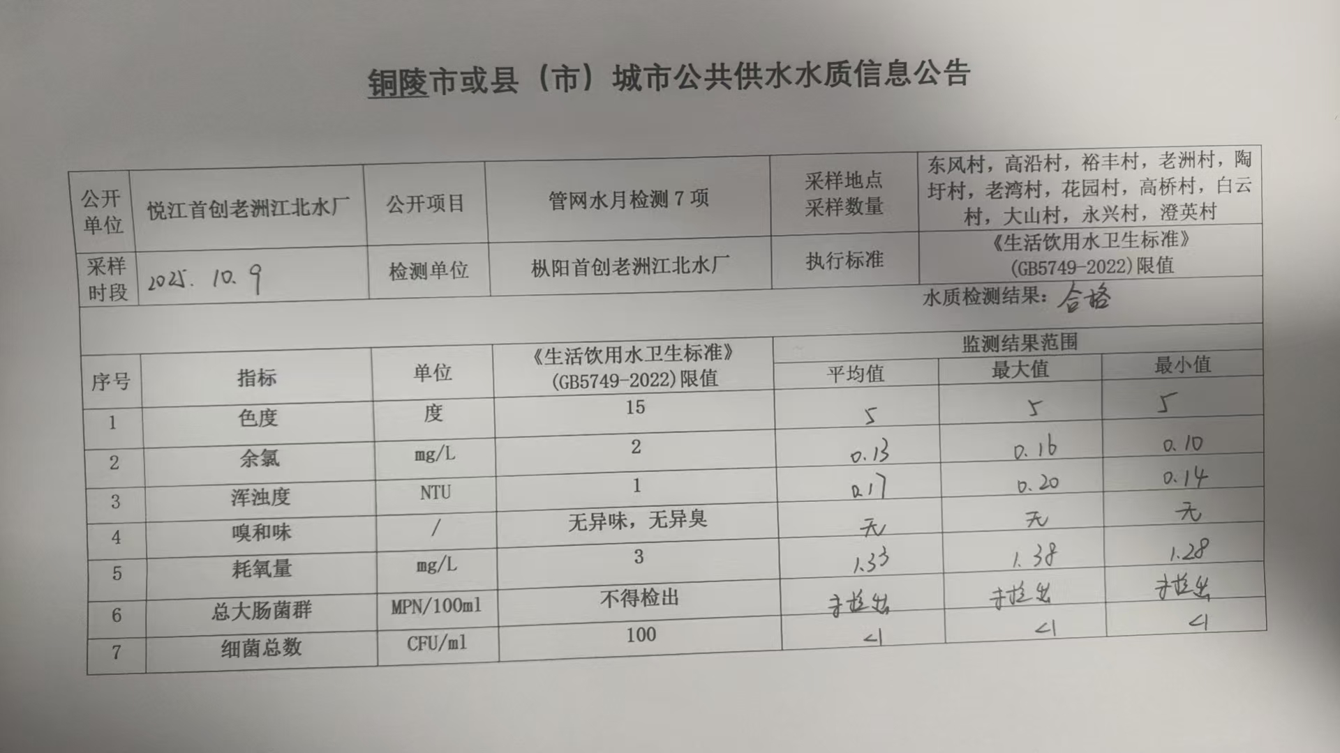 老洲水厂2025.10.9管网水