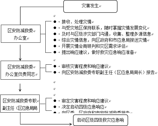 灾害发生后,区安防减救委办公室经分析评估,认定灾情达到启动标准,区安防减救委专职副主任(区应急管理局局长)决定启动四级响应,向区委、区政府和市安防减救委报告。