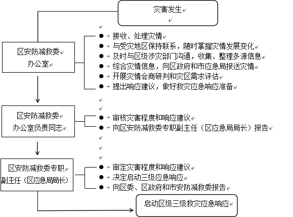 灾害发生后,区安防减救委办公室经分析评估,认定灾情达到启动标准,区安防减救委专职副主任(区应急管理局局长)决定启动三级响应,并向区委、区政府和市安防减救委报告。