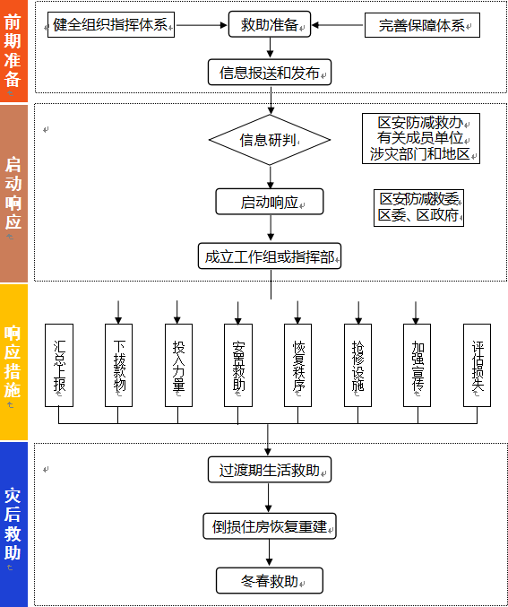 (1)区安防减救委办公室视情组织有关部门和单位召开会商会,分析灾区形势,研究落实救灾支持措施。