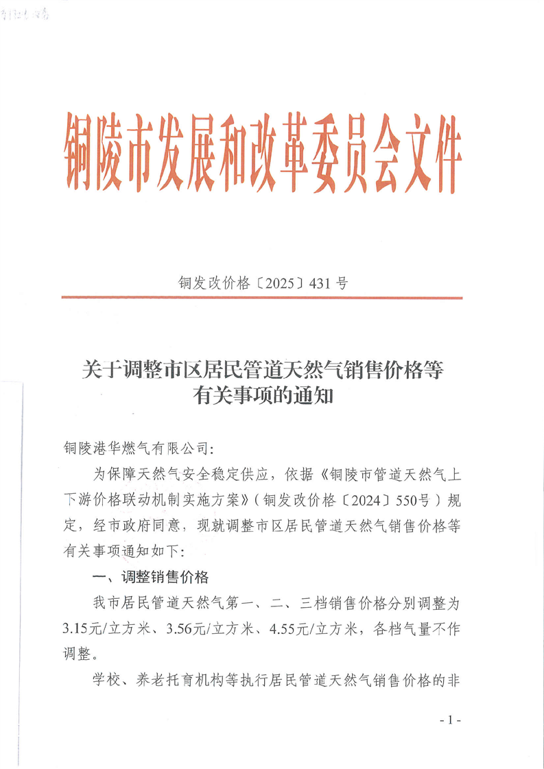 关于调整市区居民管道天然销售价格等有关事项的通知