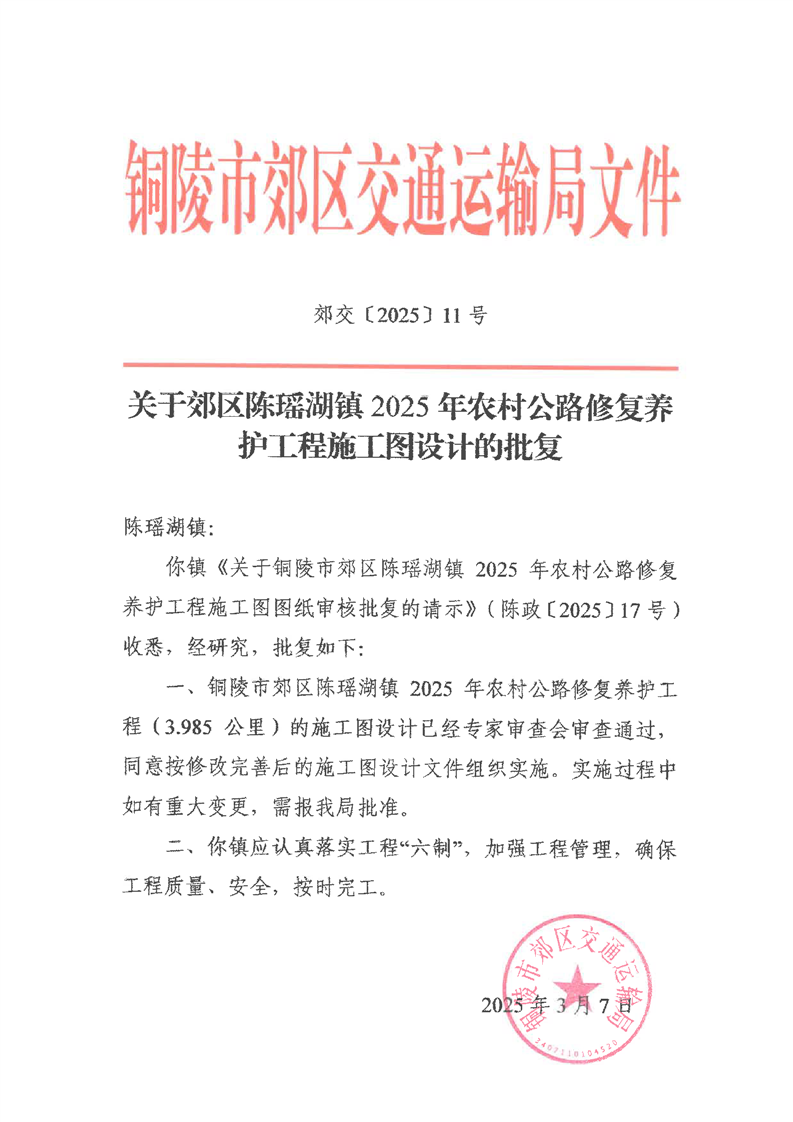 关于郊区陈瑶湖镇2025年农村公路修复养护工程施工图设计的批复