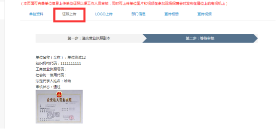 5.单位资料保存后,点击【证照上传】,组织机构代码、工商营业执照号、统一社会信用代码选填其一,【点击上传】营业执照副本和身份证照片上传成功后,此时即完成了企业注册步骤。