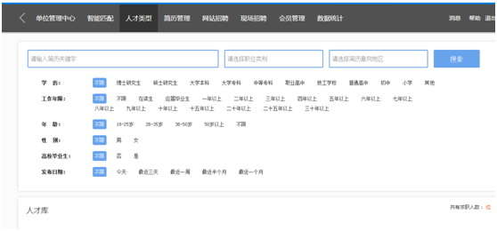 点击人才类型,可按搜索条件搜索人才,进行简历下载、发送面试邀请、收藏简历等操作。