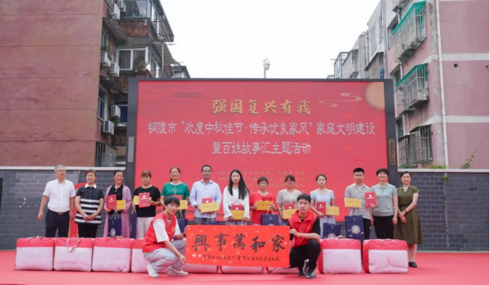 9月9日上午,强国复兴有我铜陵市“欢度中秋佳节·传承优良家风”家庭文明建设暨百姓故事汇主题活动在郊区金苑社区广场举办。市文明办副主任张春霞,市政府妇儿工委办主任钱玮芳出席。区委常委、宣传部部长江翠梅宣读《关于表彰铜陵市郊区文明家庭的决定》,区人大常委会副主任许光明参加。