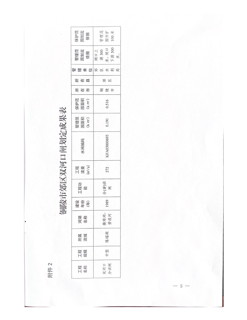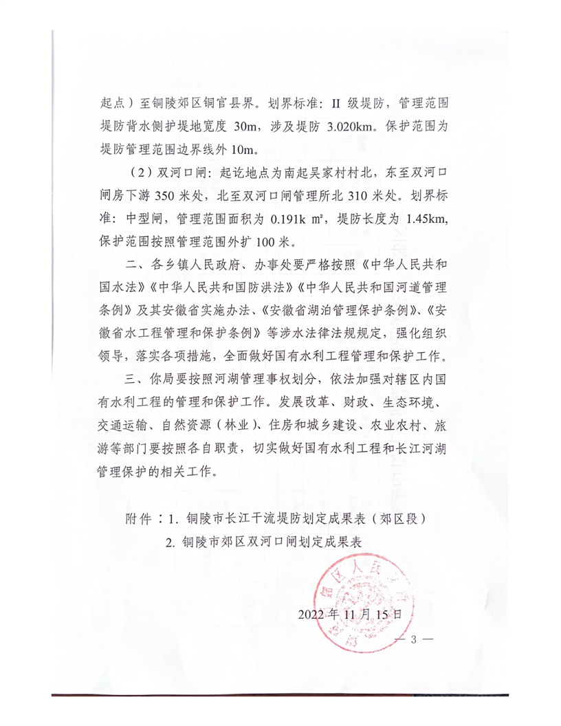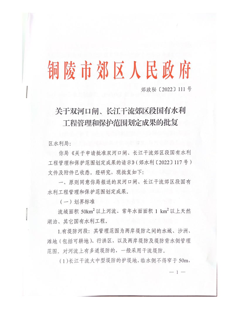 关于双河口闸、长江干流郊区段国有水利工程管理和保护范围划定成果的批复