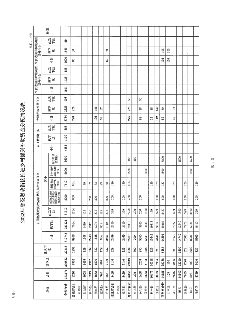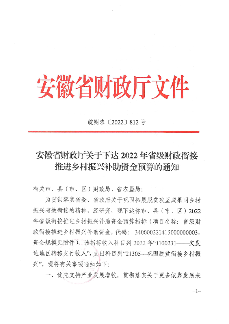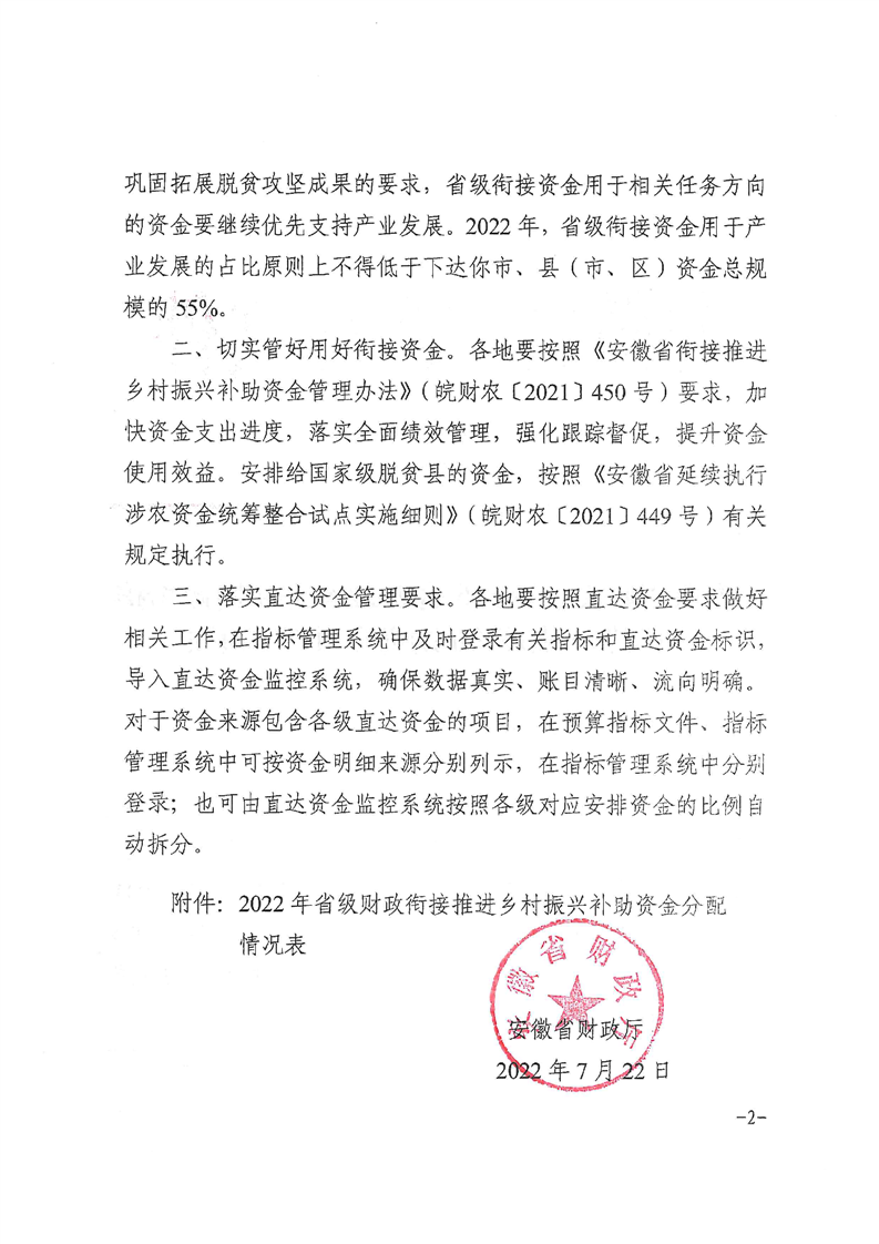 安徽省财政厅关于下达2022年省级财政衔接推进乡村振兴补助资金预算的通知