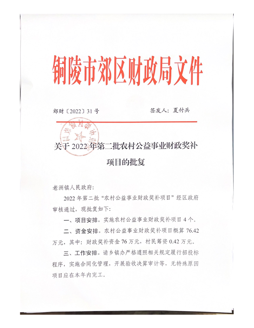 关于2022年第二批农村公益事业财政奖补项目内容变更的批复(老洲镇)