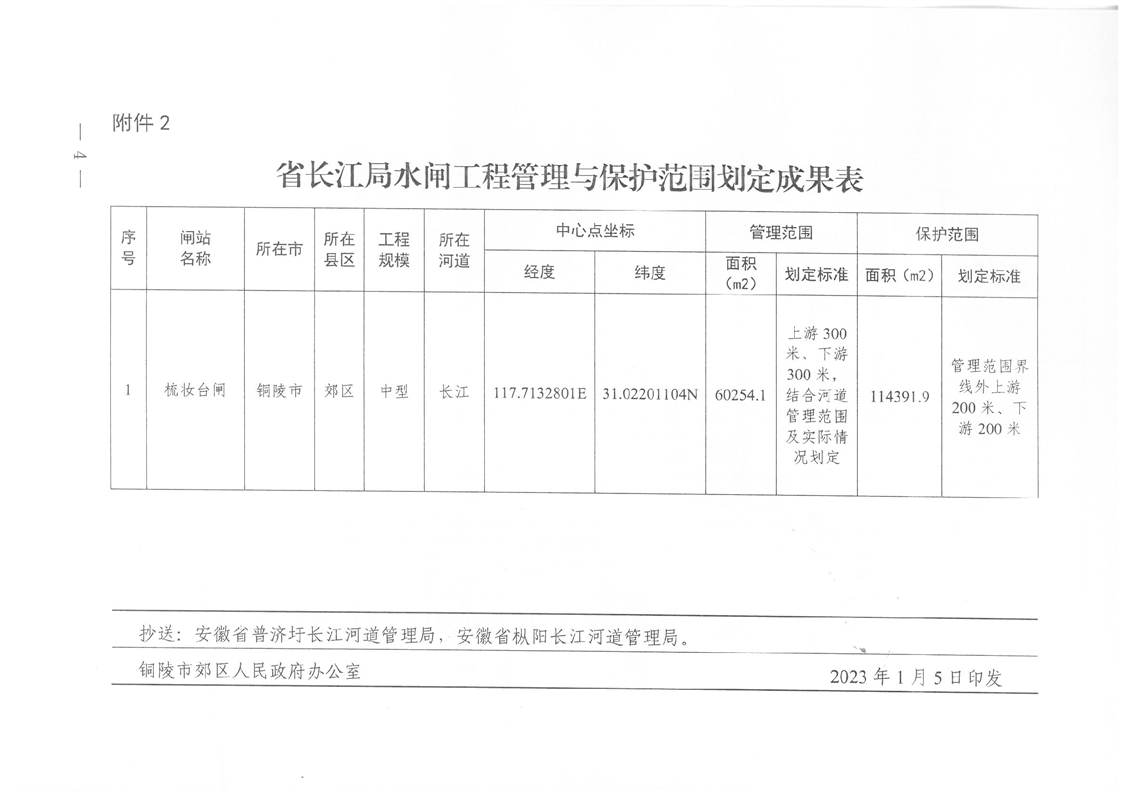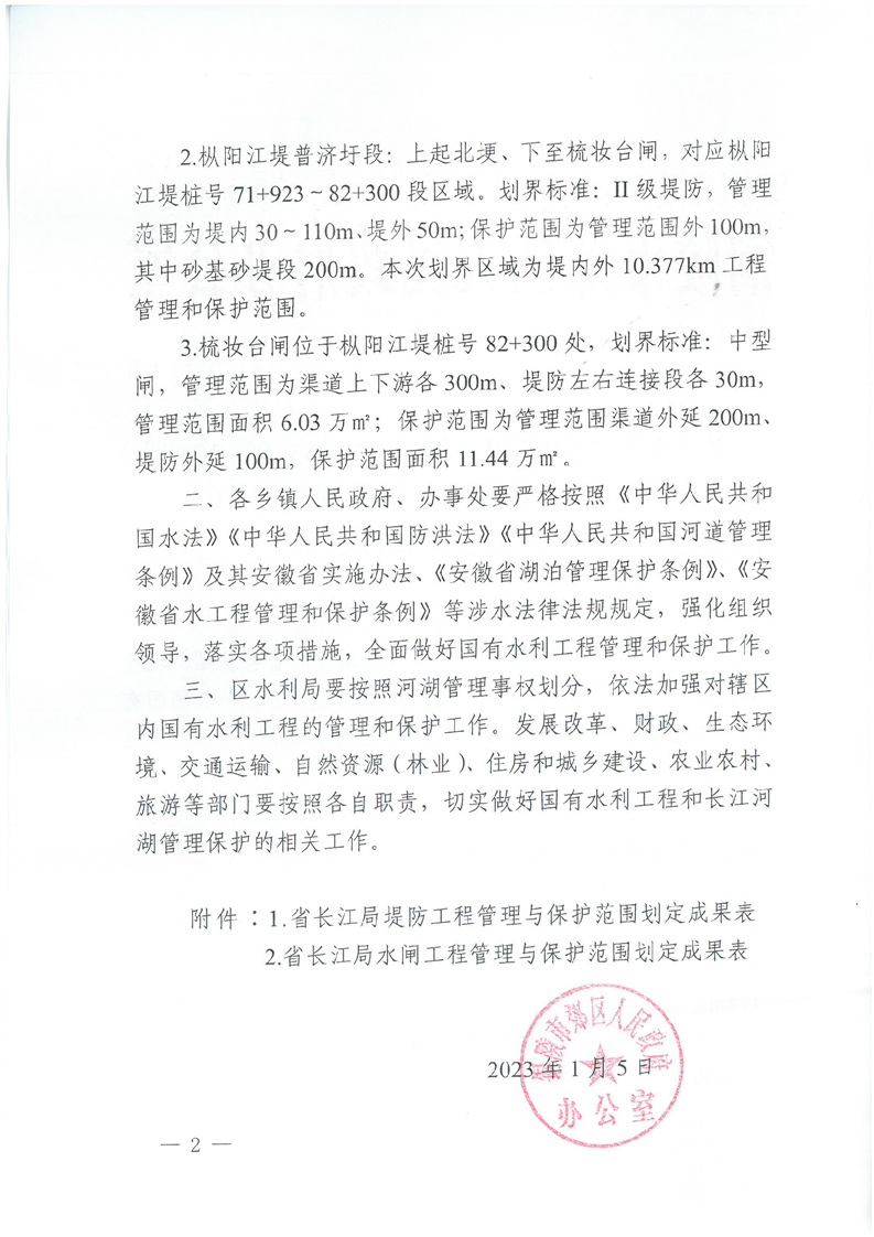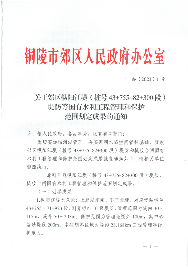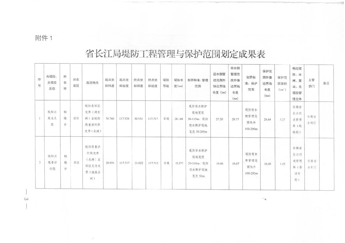 关于郊区枞阳江堤(桩号43+755~82+300段)堤防等国有水利工程管理和保护范围划定成果的通知