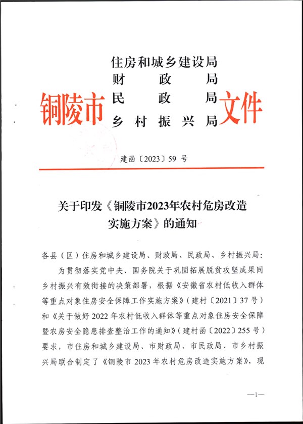 转发关于印发《铜陵市2023年农村危房改造实施方案》的通知 建函【2023〕59号