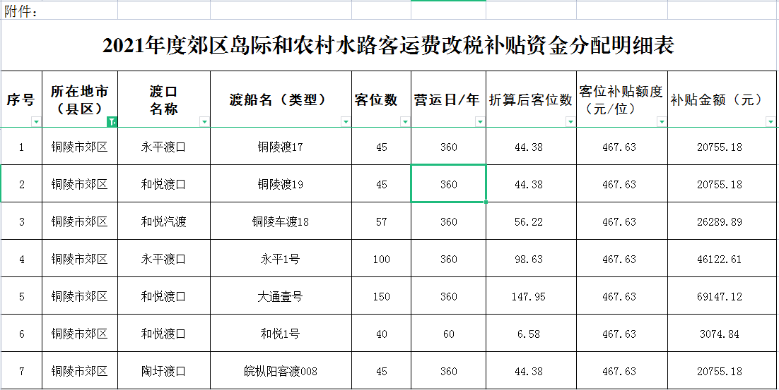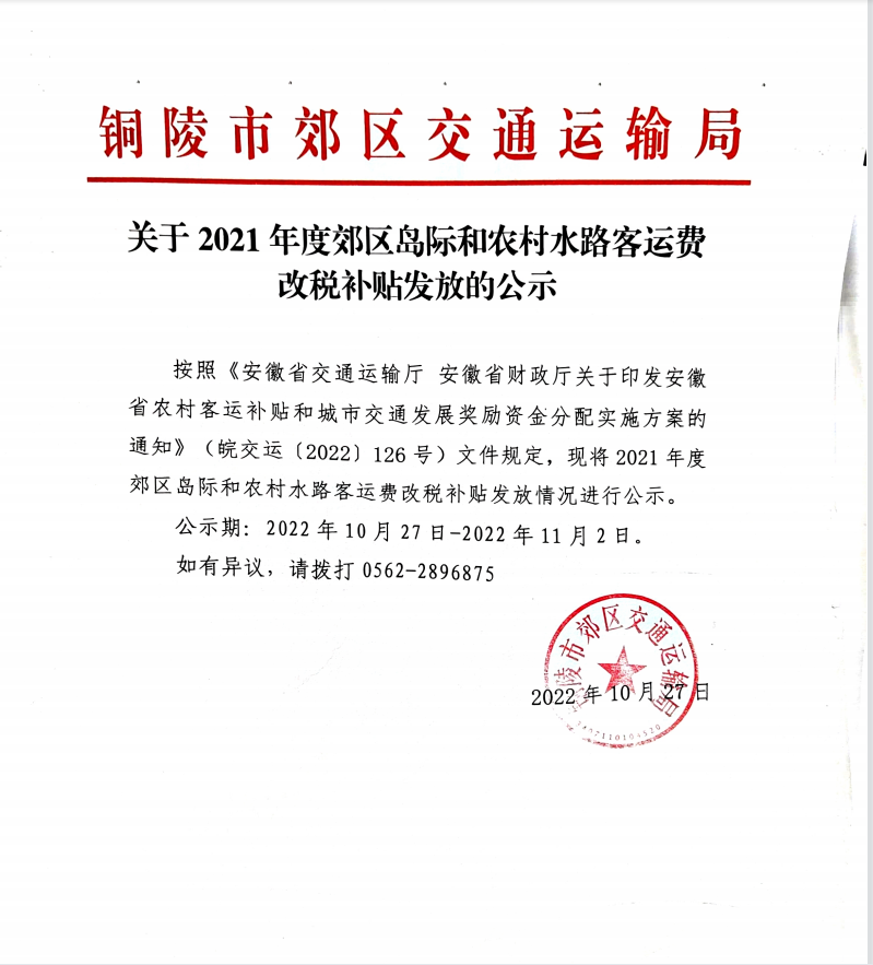 关于2021年度郊区岛际和农村水路客运费改税补贴发放的公示