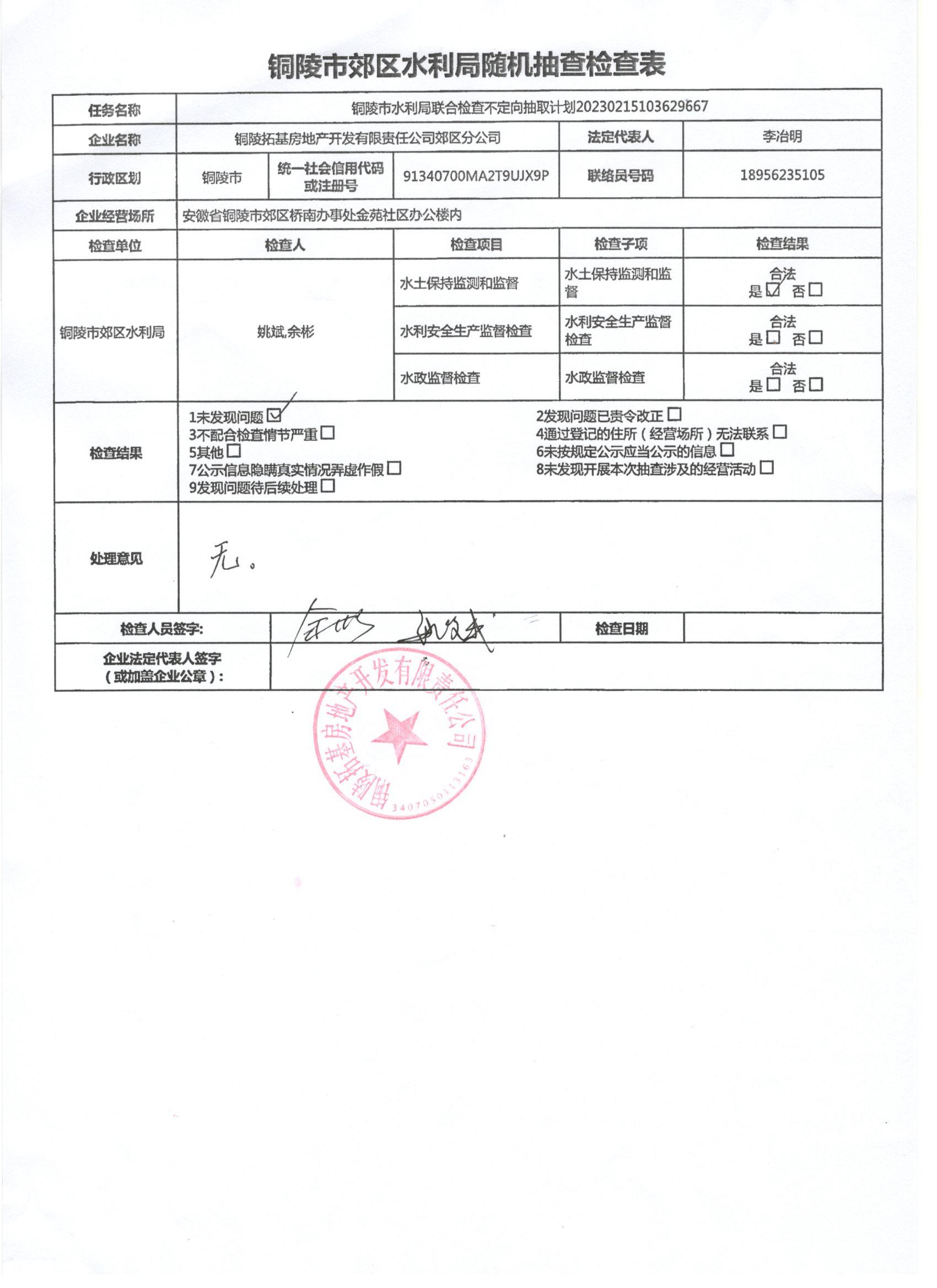 铜陵市郊区水利局“双随机、一公开”拓基地产水保检查表