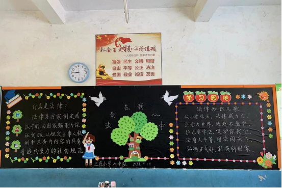 出一期法治黑板报。组织全校各年级各班级开展了以“法润童心 护航成长”为主题的黑板报展示活动,黑板报内容丰富,图文并茂,使学生们在创作中进一步树立社会主义法治观念,增强法治意识。