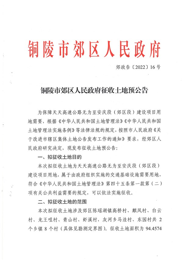 铜陵市郊区人民政府征收土地预公告(天天高速无为至安庆段(郊区段)建设项目)