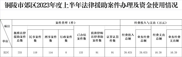 铜陵市郊区司法局2023年上半年法律援助案件办理及资金使用情况