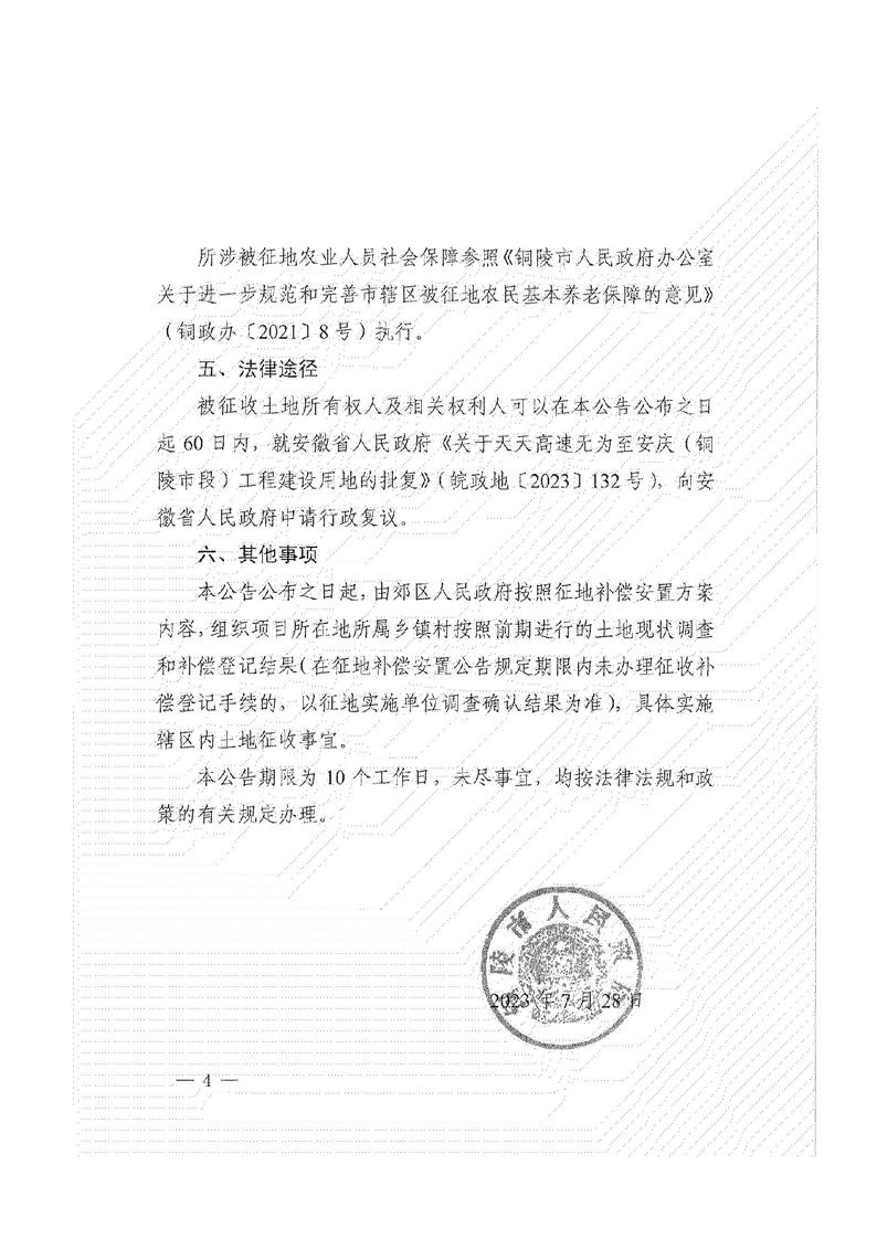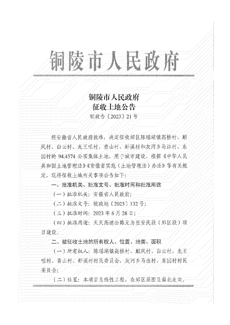 铜陵市人民政府征收土地公告【天天高速公路无为至安庆段(郊区段)工程建设项目】铜证告〔2023〕20号