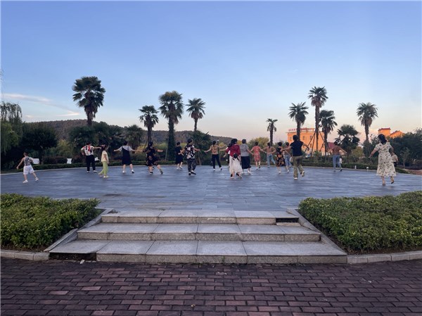 夕阳映晚霞,歌声传悠扬,踏着快乐节拍,舞一曲幸福绵长。
