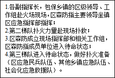 第三梯队:区应急民兵、其他乡镇扑火队、社会化应急救援队。