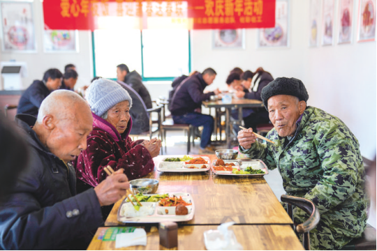 郊区通过建立老年人助餐点,拓宽助餐覆盖面,为辖区老年人提供“暖心餐”,让老年人享受幸福“食”光。图为在郊区大通镇和悦村老年食堂,前来就餐的老人围桌而坐,边吃边话家常。