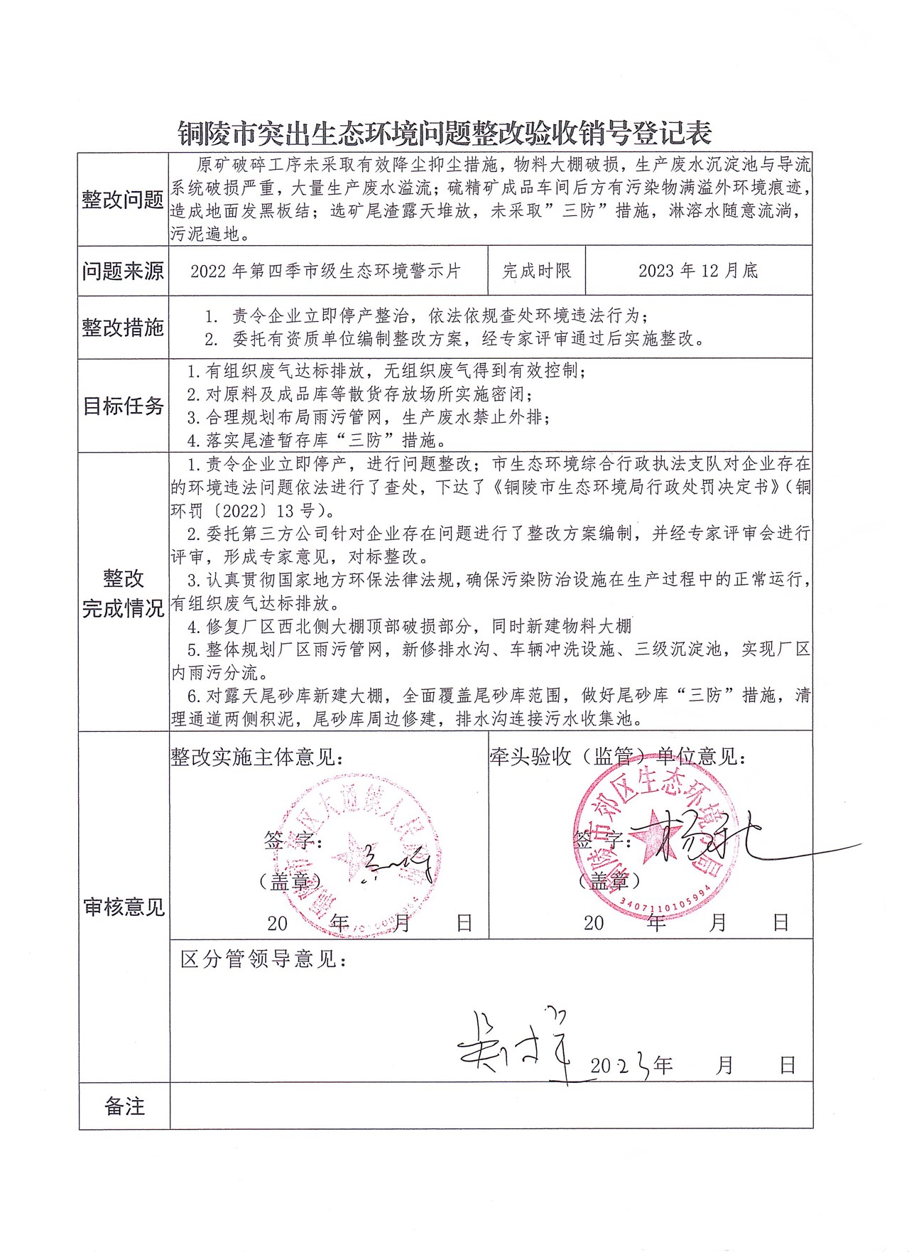 根据铜陵市郊区生态环境问题整改验收销号管理有关要求,现将2022年第四季市级生态环境警示片华安矿业存在的环境问题整改落实情况予以公示,公示期7个工作日,如果有异议,请拨打0562-2896834电话反映: